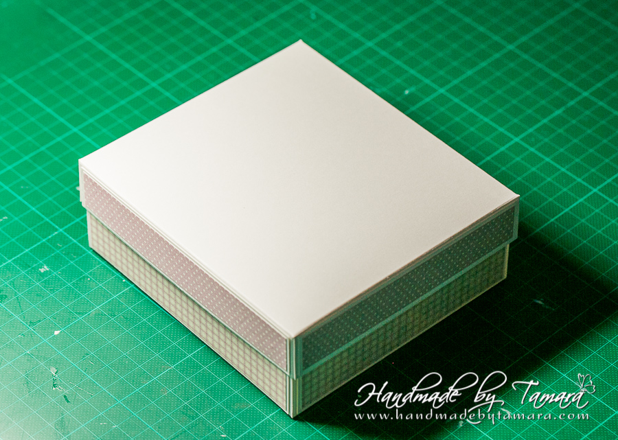 Carefully put the box base to the center of the sturdy bottom/top we made in previous step. Be careful that you adhere the bottom of the box on the bottom layer so that the design paper faces UP!!!